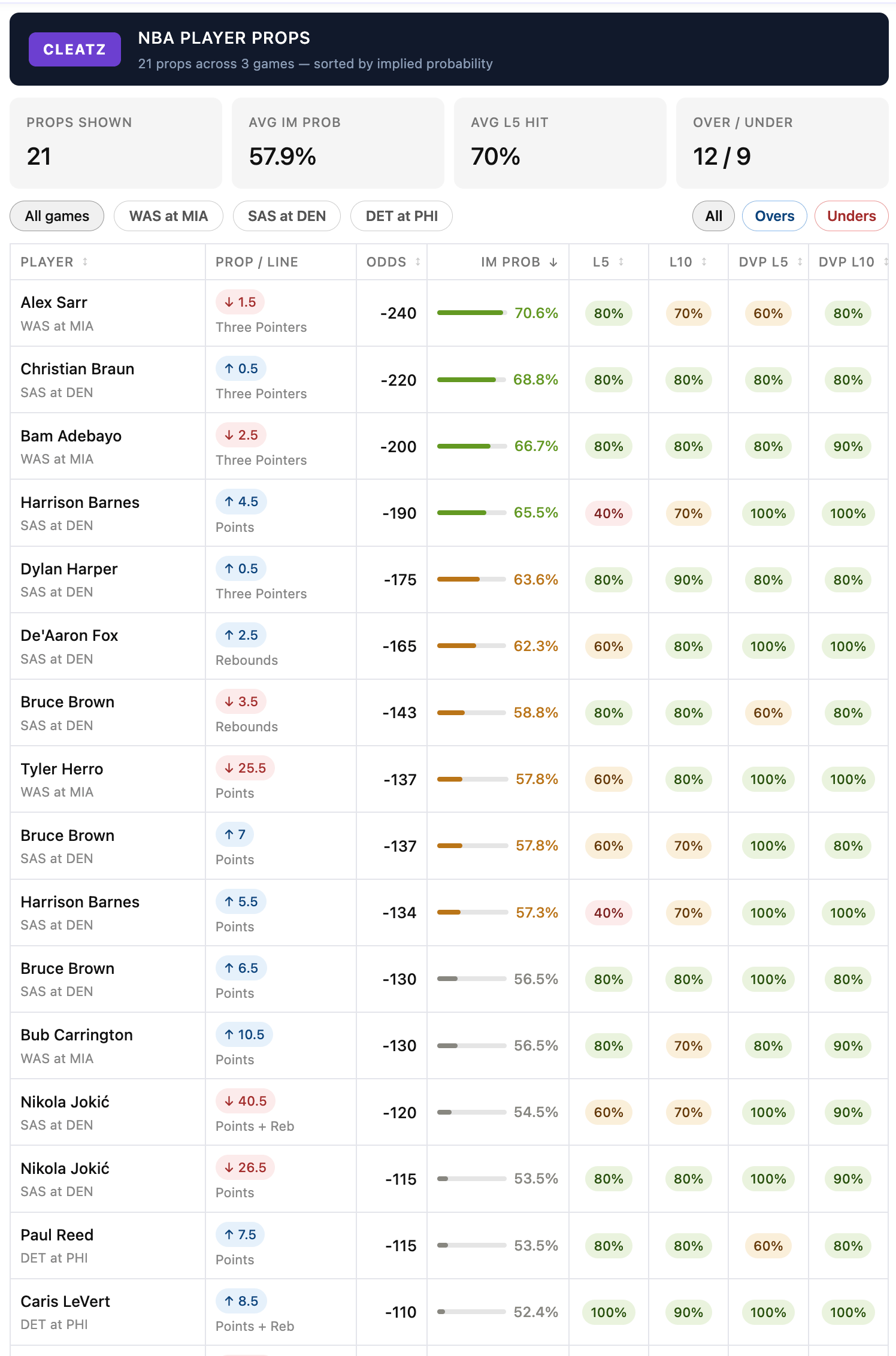 Our NBA data has been exceptionally strong this season. Built specifically for parlay construction, our hit-rate tracking and DvP (defense vs. position) filters surface the best nightly opportunities in one place.