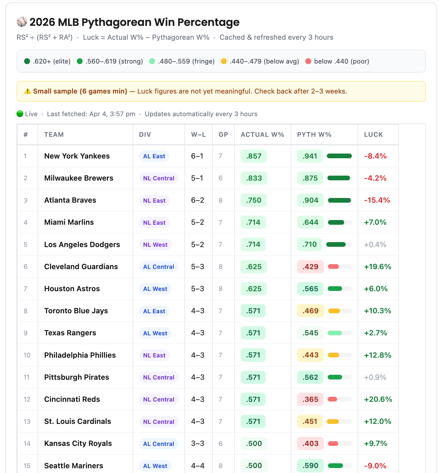 2026 MLB Pythagorean Win Percentage