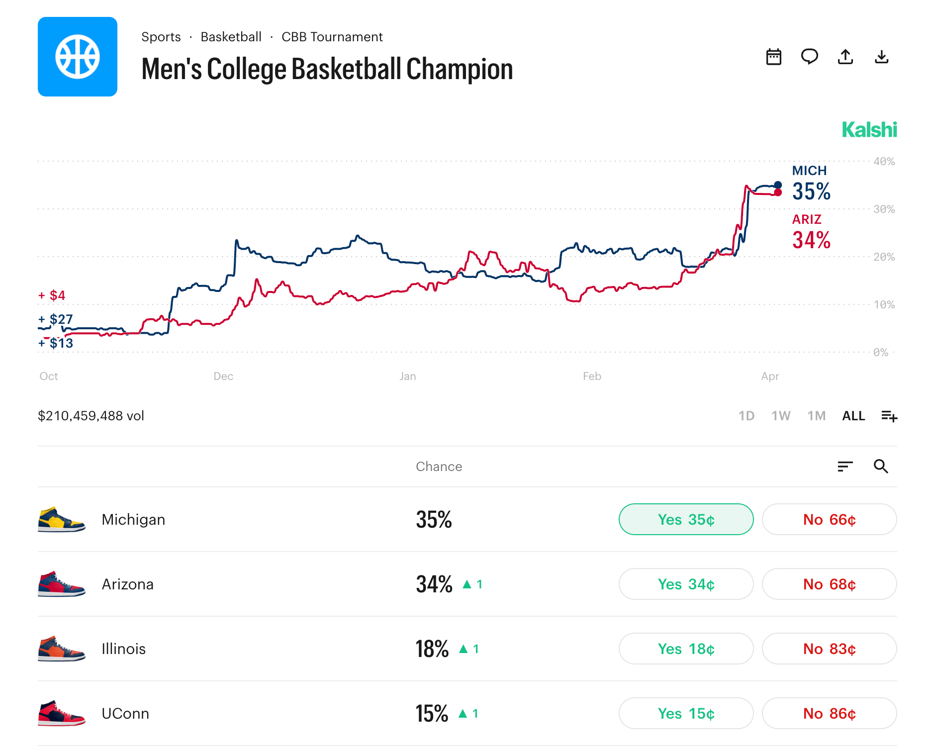 Trader's Note: Monitor the Illinois vs. UConn result closely. If the underdog (UConn) wins the early game, expect the prices for Michigan and Arizona to tick upward slightly as the market anticipates a "weaker" finals opponent for the heavyweights.