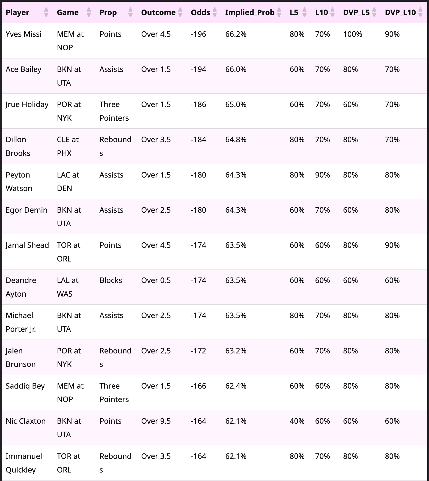 Our NBA data has been exceptionally strong this season. Built specifically for parlay construction, our hit-rate tracking and DvP (defense vs. position) filters surface the best nightly opportunities in one place. As shown, many of the heavier moneyline prices align closely with high implied probabilities, reinforcing the edge behind these selections.