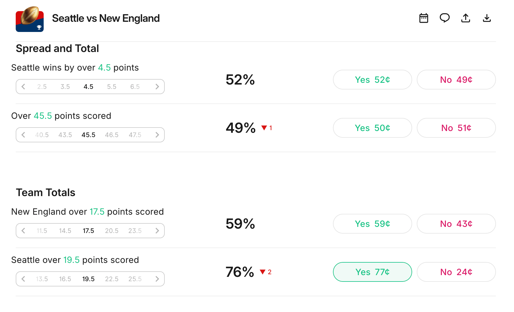 Those look like crowd favorites, but they’re only profitable if your own view implies higher expected points than the market price. Seattle’s 76% implies a heavy lean on scoring; if you forecast a lower scoring game, selling Seattle Over could be a winning play even if Seattle still scores a couple touchdowns.