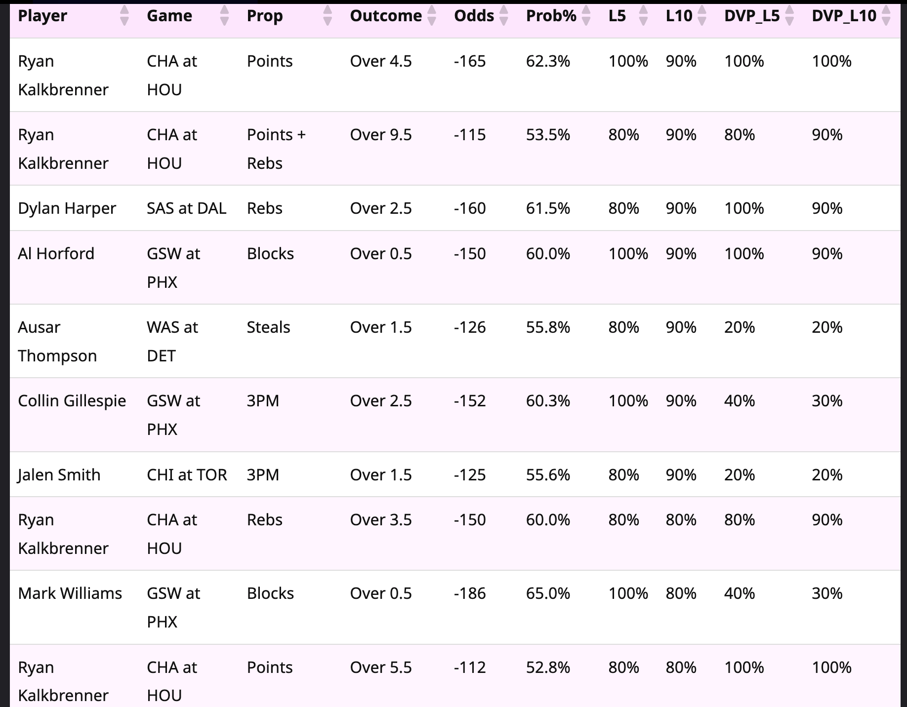 Our NBA data has been exceptionally strong this season. Built specifically for parlay construction, our hit-rate tracking and DvP (defense vs. position) filters surface the best nightly opportunities in one place. As shown, many of the heavier moneyline prices align closely with high implied probabilities, reinforcing the edge behind these selections.