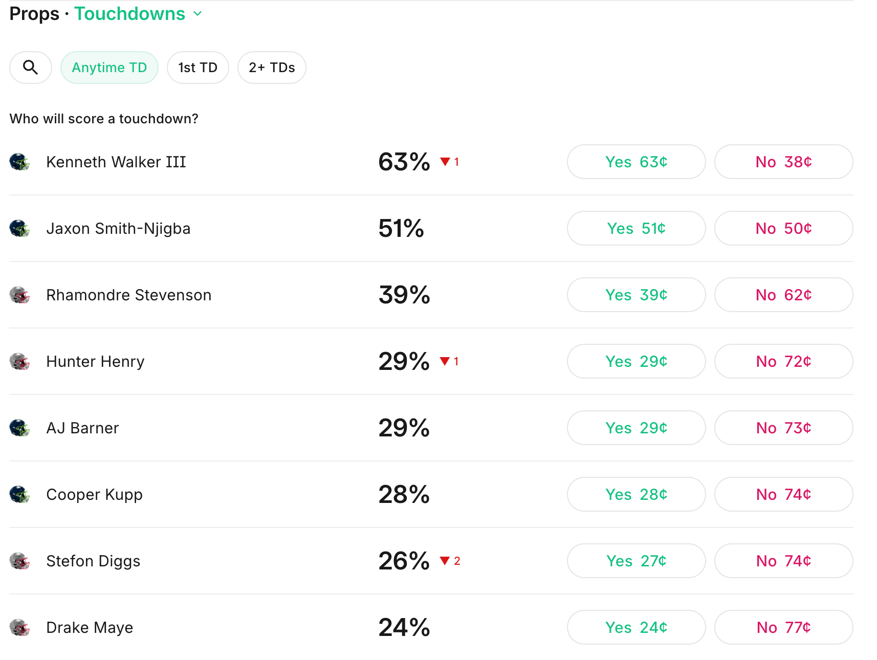 These percentages are implied probabilities based on contract prices. On Kalshi, a Yes contract trading at 68¢ implies a ~68% chance that outcome occurs; if you think Seattle’s chances are higher than that, it represents value to buy. If you think it’s overbought, you can sell or even take the No side.