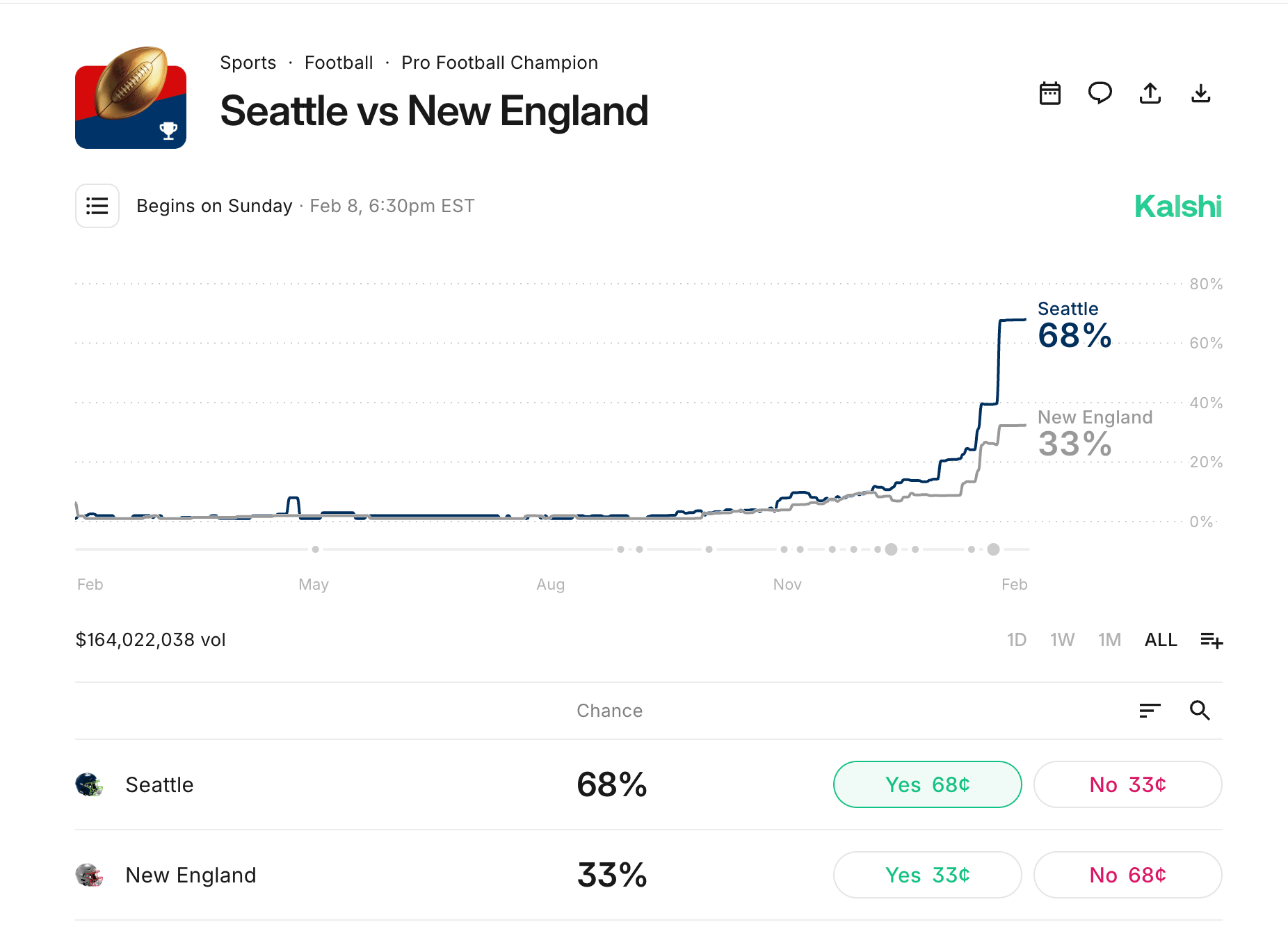 Buying Seattle Yes near 68¢ only makes sense if you believe Seattle is more likely than 68% to win.
