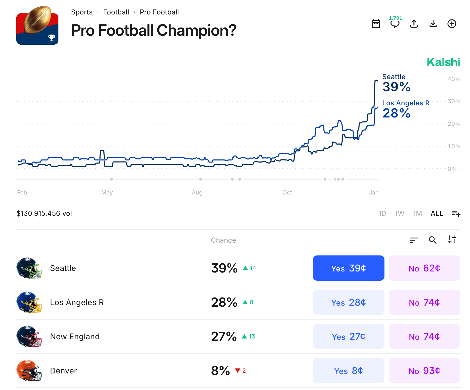 🏈 Super Bowl Champ Trading Value on Kalshi